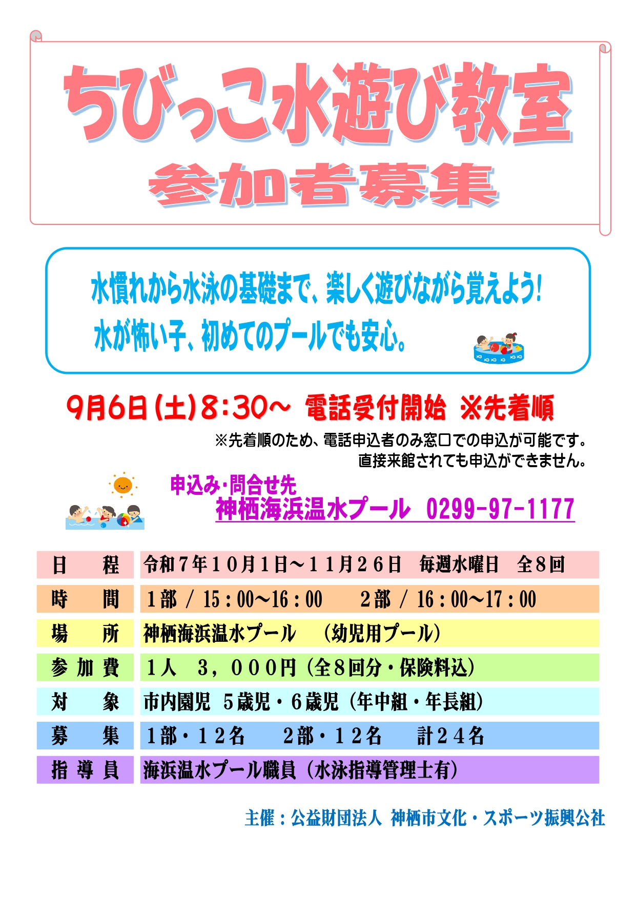 New!! 令和7年度秋季ちびっこ水遊び教室 令和7年度春季ちびっこ水遊び教室 令和6年度秋季ちびっこ水遊び教室 令和6年度春季ちびっこ水遊び教室 令和5年度秋季ちびっこ水遊び教室(ポスターは削除しました) 令和5年度春季ちびっこ水遊び教室(ポスターは削除しました) 令和4年度秋季ちびっこ水遊び教室(ポスターは削除しました)
